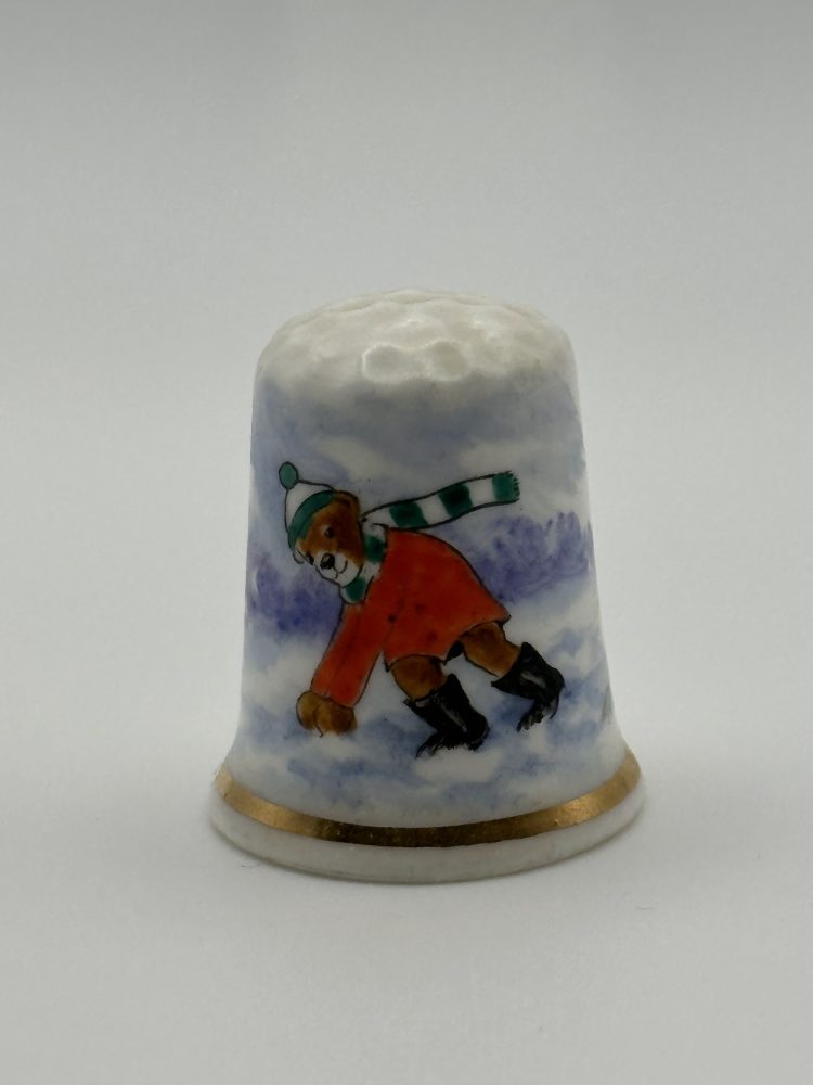 Hand painted porcelain thimble by Graham Payne of a bear in the snow. It is in very good condition.