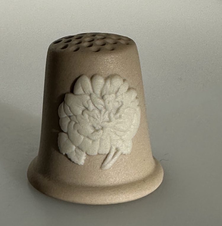 A stone beige coloured jasper ware thimble marked Made in England with a white cameo of Peony flowers.  The thimble is in very good condition.